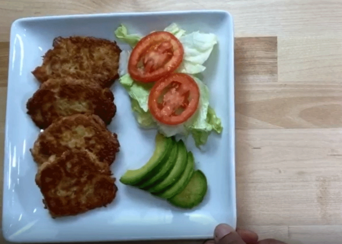 Boil potatoes until cracked. Mash potatoes. Drain 3 cans of tuna. Add tuna into the boil of mashed potatoes. Mix together. Add three eggs, dash of salt and pepper. Mix until combined. Form patties in your hand. Add oil to the pan. Cook patties on medium heat. Serve with lettuce, tomato and avocado.