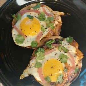 Microwave the canned black beans in a microwave safe dish until warm and slightly mash the beans with a fork. Pour enchilada sauce onto pan, then sprinkle shredded cheese and allow to cook for a few minutes. Crack an egg on top of each pile of enchilada sauce and cheese and cook until egg whites are fully cooked. Top with your choice of fresh or pickled red onion and cilantro.