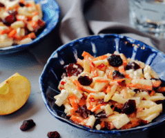 Grate carrots and apples. Mix with Greek yogurt, honey, and a splash of lemon juice. Refrigerate and serve as a refreshing side.