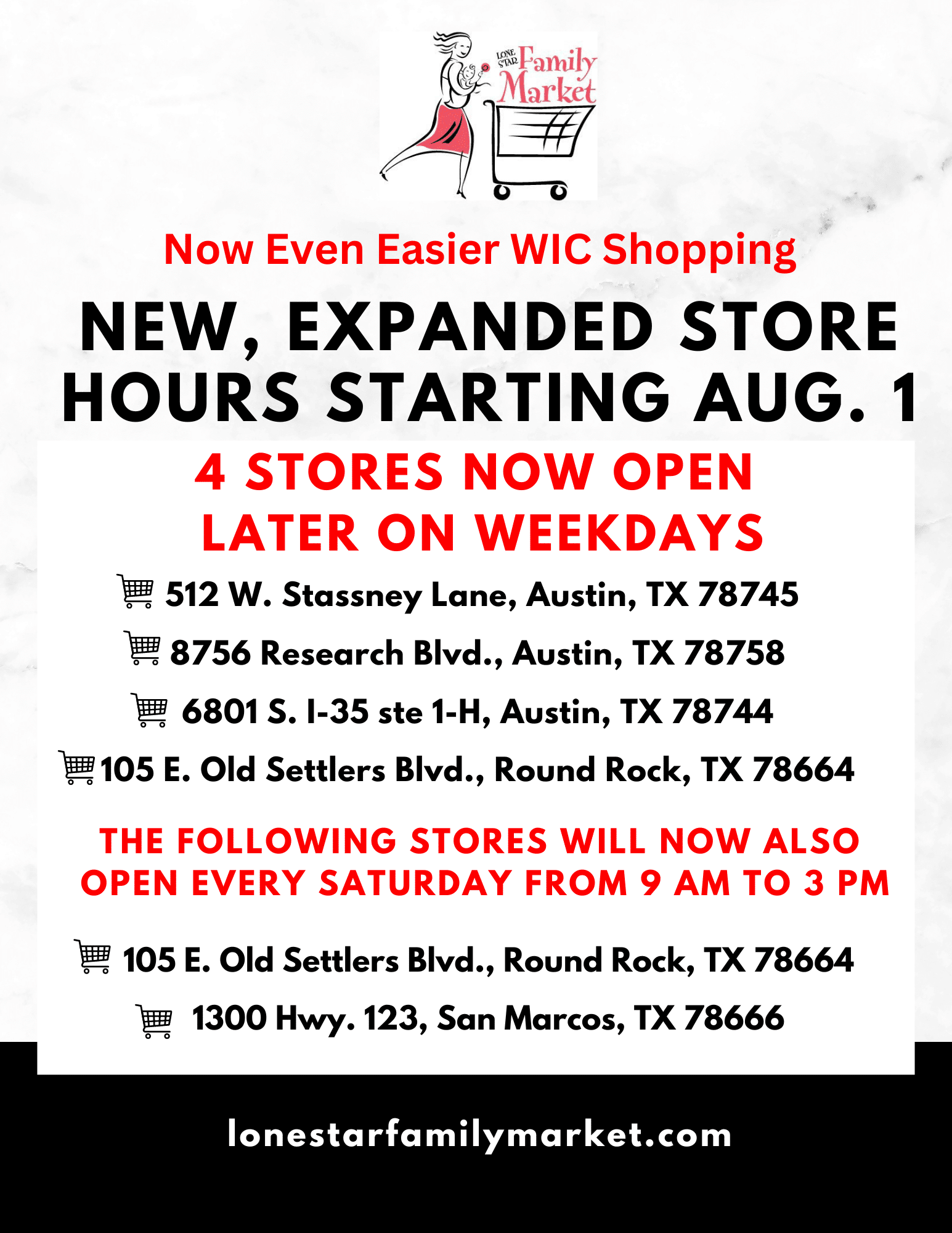Exciting News! Shauna Siegel2024-09-19T07:21:18-05:00July 15th, 2024|Lone Star Family Market, WIC Grocery Shopping|Comments Off on Exciting News! Share This Story, Choose Your Platform! FacebookXRedditLinkedInWhatsAppTumblrPinterestVkEmail About the Author: Shauna Siegel Related Posts Open, Accepting WIC Open, Accepting WIC 2 More Stores Open Later Monday – Thursday 2 More Stores Open Later Monday – Thursday Lone Star Family Market News Lone Star Family Market News Update! Update!