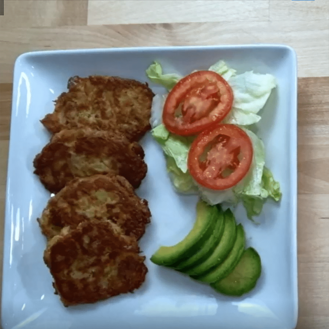 Prepare un puré de papa en un tazón por separado. Escurra 3 latas de atún. Agregue el atún al puré de papas. Mezcle todo junto. Agregue tres huevos, una pizca de sal y pimienta. Mezclar hasta que esté combinado. Forme empanadas o tortitas con tu mano. Caliente poco aceite en la sartén y Cocine las empanadas a fuego medio. Sirva con lechuga, tomate y aguacate.