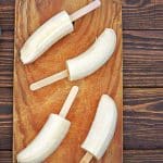 Inserte el palito de paleta en el fondo del plátano. (ver foto). Combine el yogur, la miel de maple y la canela en un bol y mezcle. Sumerga los plátanos en la mezcla. Coloque los plátanos sumergidos en una bandeja para hornear galletas. Puede agregar chispas o mini chispas de chocolate para mayor diversión. Congele durante aproximadamente 6 horas o hasta que el yogur esté congelado.